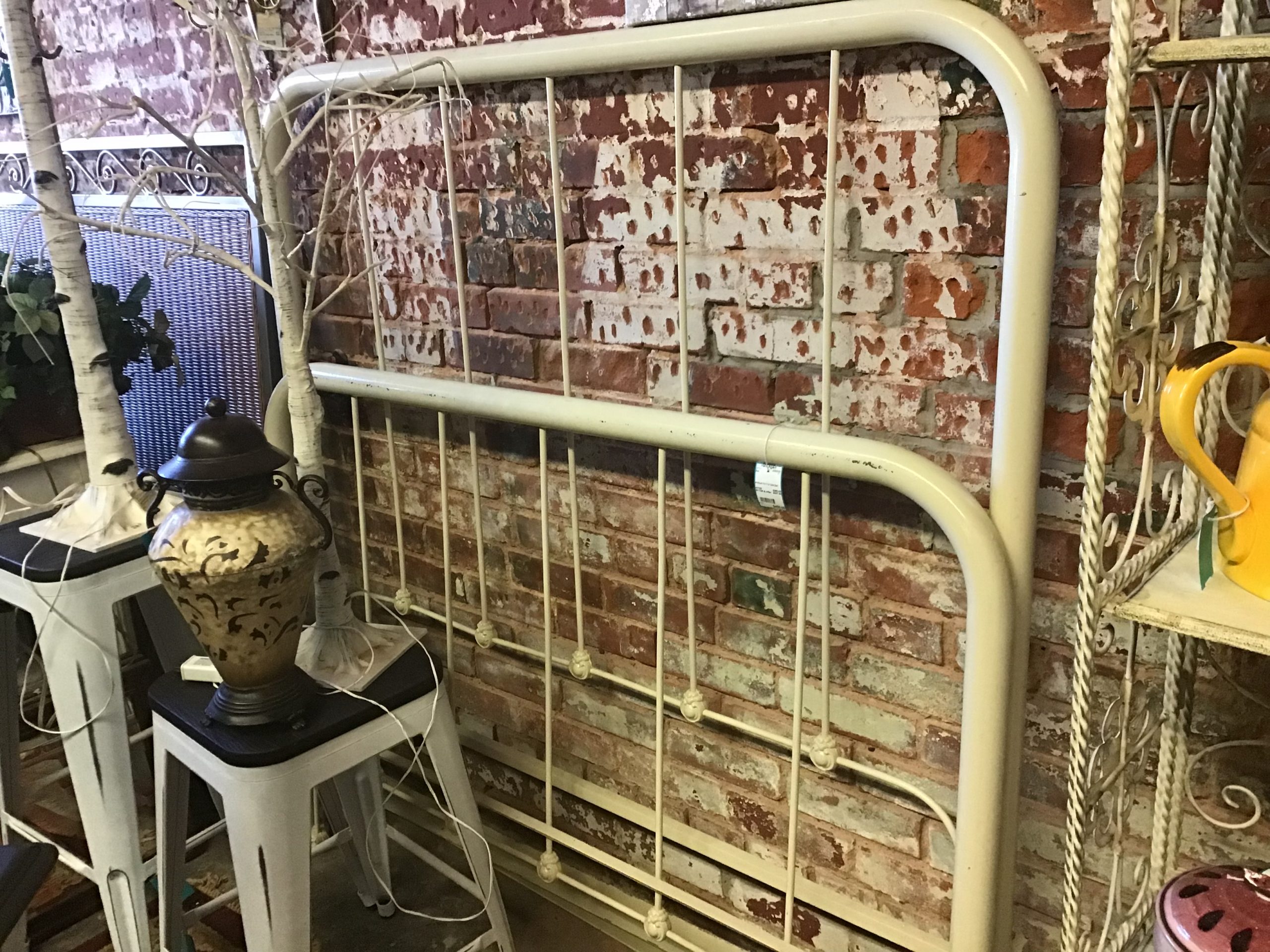 White antique iron bed.  This is a full size with knob connections.  This gem will last another 100 years — great for the country cottage look or industrial flair.  They don’t make things like this anymore!