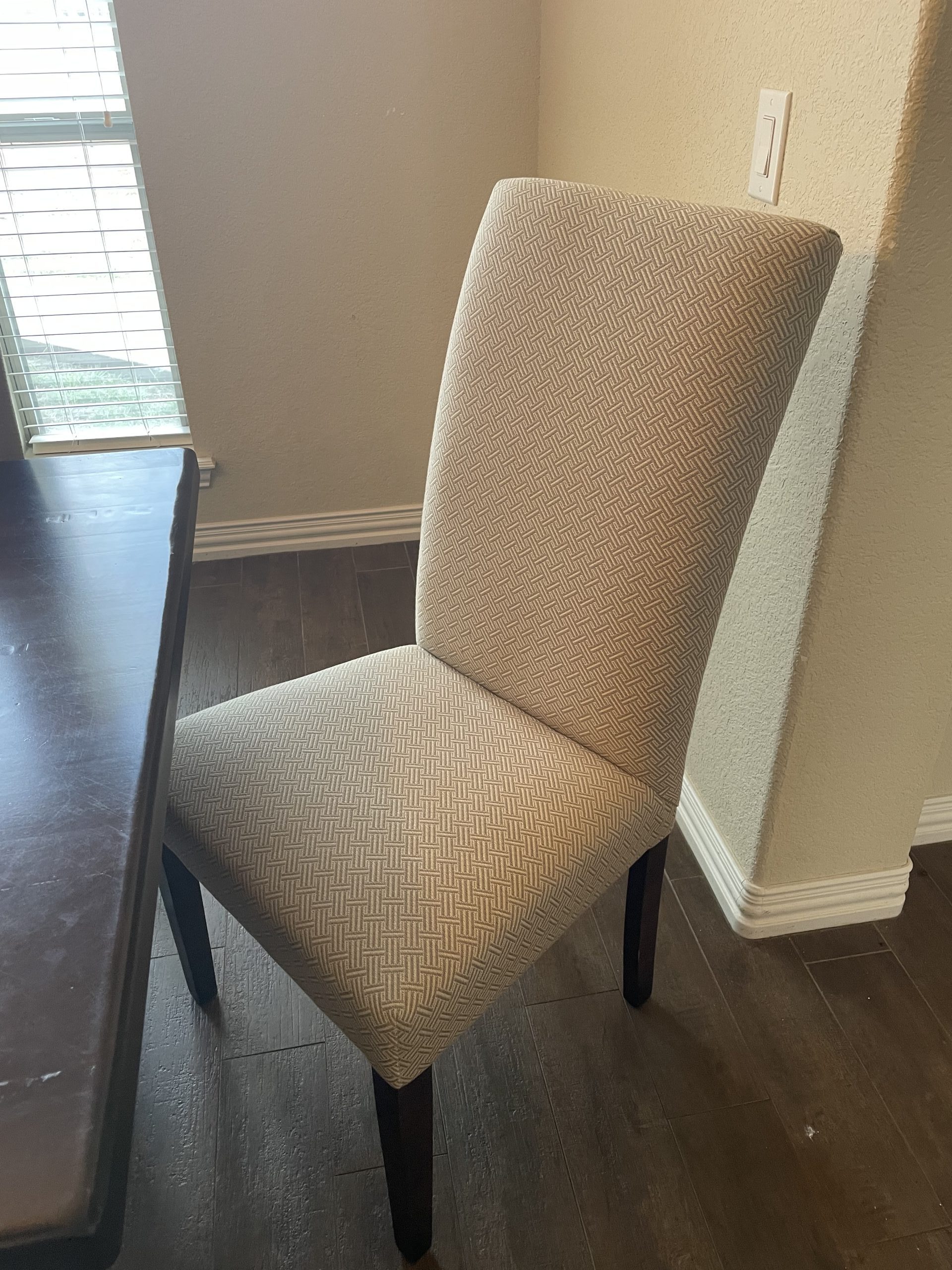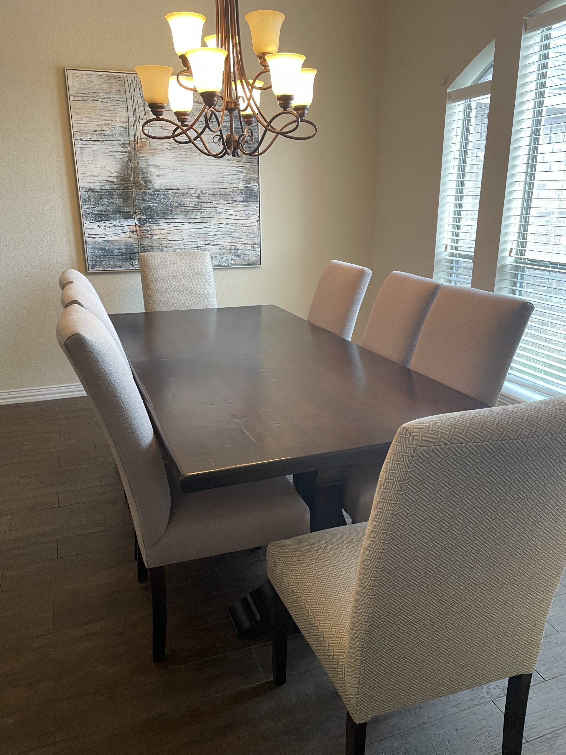 This dining room set is so beautiful and ready to adorn your home. Table is 90″ long in a dark wood tone, tressle style. The set is complete with 8 contemporary chairs in cream/beige tones