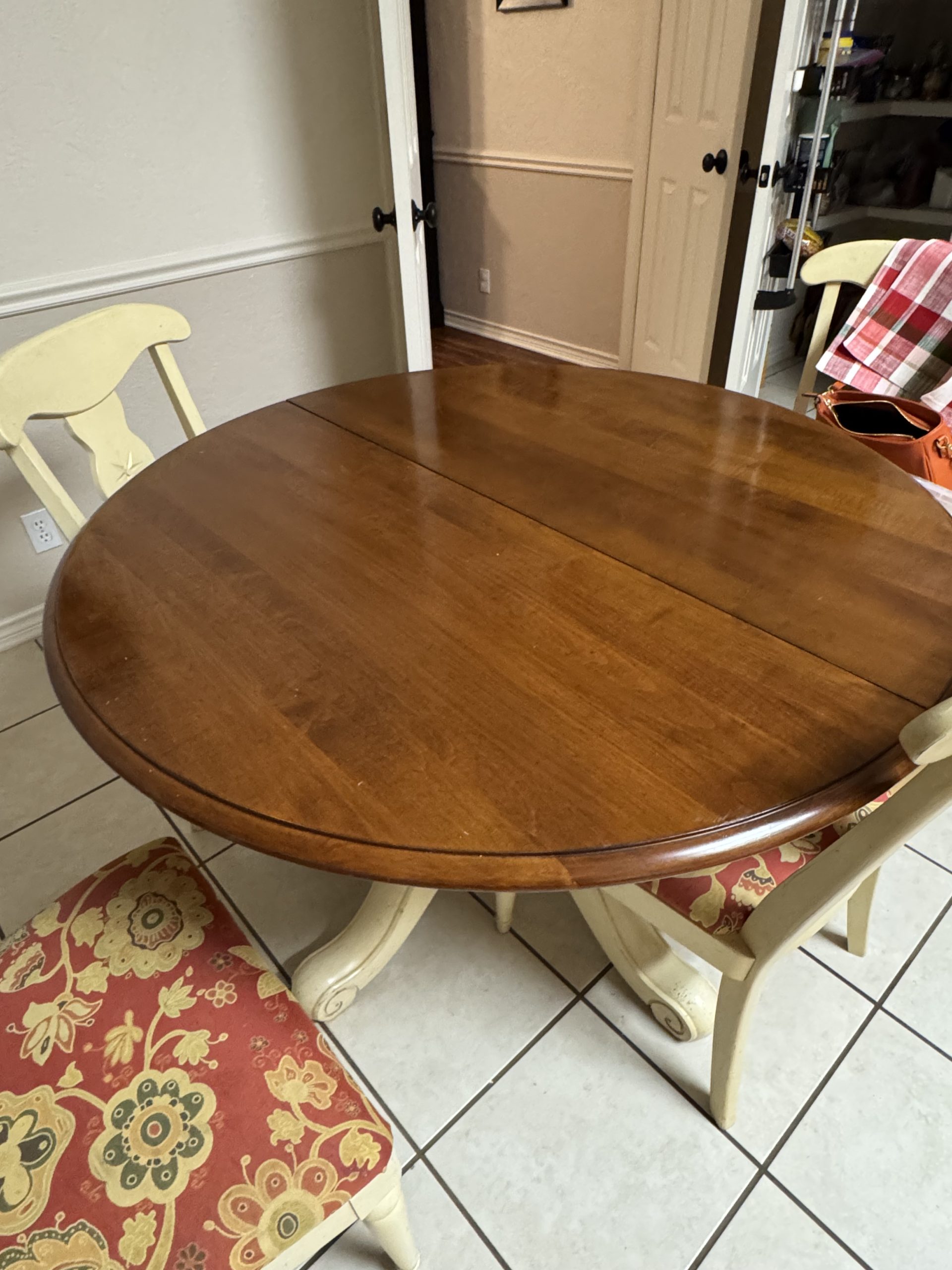 This is a great round table with 4 chairs — Bonus it comes with a leaf, so six people can easily dine at this lovely table.